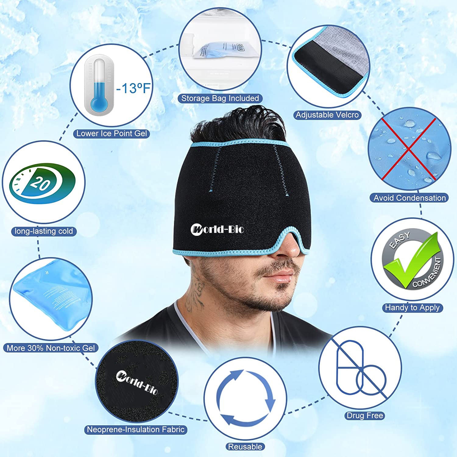 - Patented Designed for migraine relief by cold compression therapy - This headache relief cap with a cold gel pack combines the benefits of cryotherapy and compression. Stretchy neoprene wrap is tailored to the head to keep adding compression pressure, holding the chilliness for a longer time. Gel ice pack migraine cap effectively relieves headache, migraine, inflammation, puffy eye, and speeds up the healing time to recover after injury or surgical procedure.