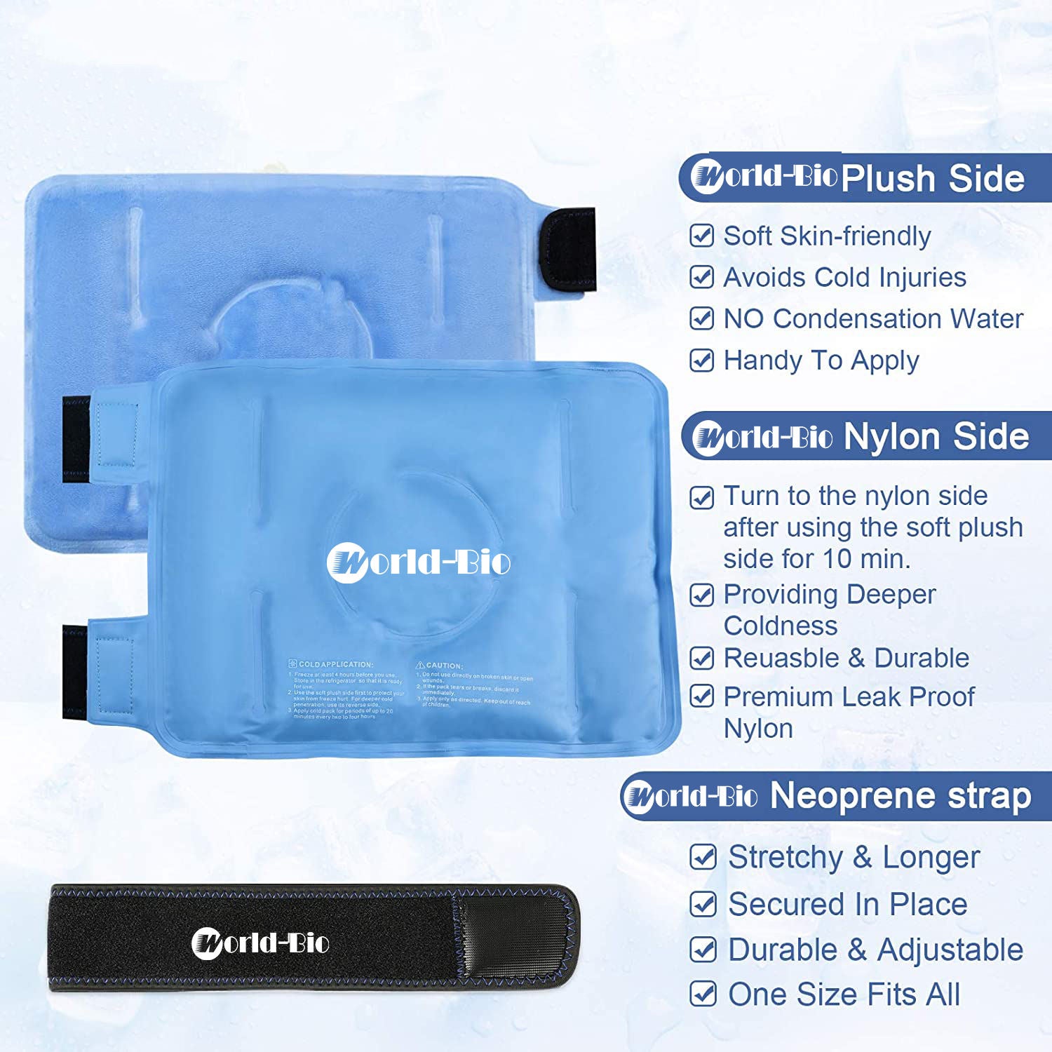 - Patented Ice Pack for Knees - These gel knee ice packs are newly designed with a soft terry cloth side that is convenient to apply without towel wrapping. The fleece cover helps your knee gradually adapt to the cold and prevents condensation water from dripping down for cooling. These cold wraps effectively relieve bruising, swelling, sprains, inflammation and speed up healing time, help muscles recover after strenuous activity, injury or surgical procedures, and recharge muscles after the gym.
